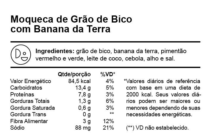 Moqueca de grão de bico com banana da terra e pimentões, cozida em leite de coco. Refeição leve, rica em proteínas vegetais, fibras e vitaminas, com baixo índice calórico e excelente densidade nutricional.