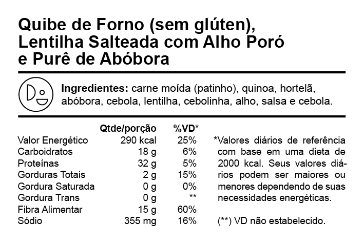 Quibe de quinoa e carne magra temperada com hortelã, acompanhado de lentilha salteada com alho-poró e purê de abóbora. Uma refeição completa, sem glúten, nutritiva e cheia de sabor.