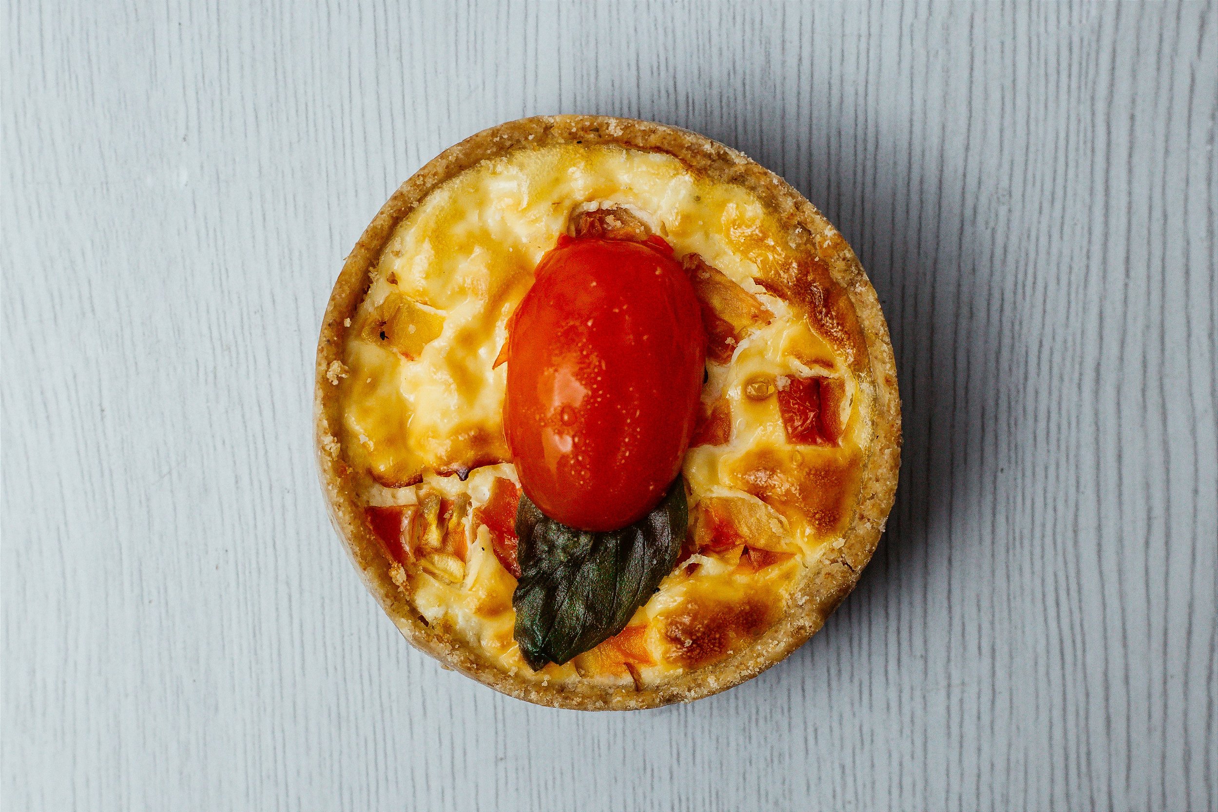 Ingredientes: Farinha de trigo integral, mussarela, queijo ricota, requeijão cremoso, margarina, tomate, ovo, banha suina, cebola, queijo parmesão, sal, manjericão e tomate cereja.