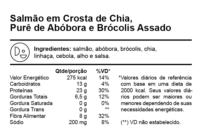 O salmão recebe uma crosta nutritiva de chia e linhaça, servido com purê de abóbora cremoso e brócolis assados. Uma refeição completa e funcional.