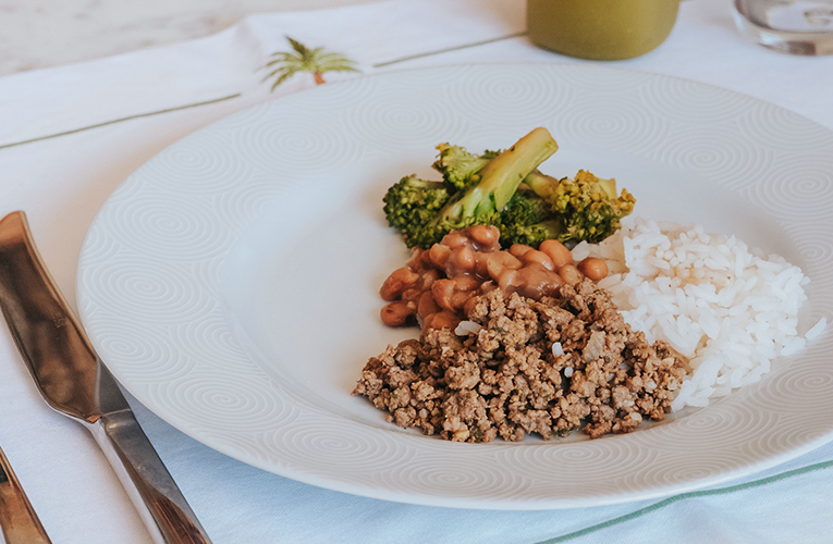 Patinho moído acompanhado de arroz, feijão carioca e brócolis. Uma refeição simples, porém muito nutritiva, para facilitar sua rotina.